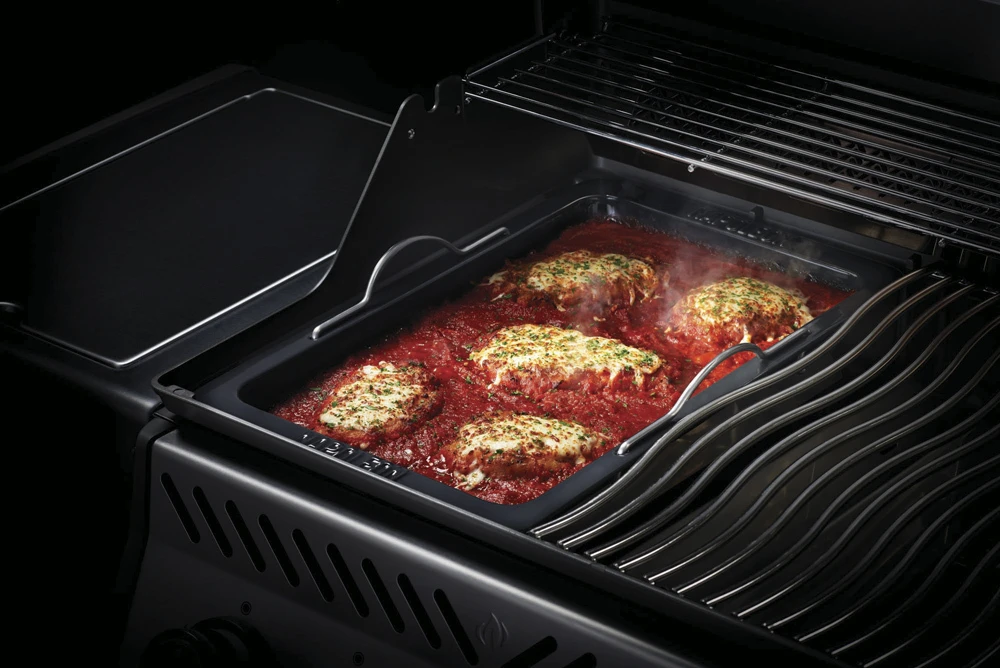 La bandeja para asar de Napoleon está hecha para adaptarse perfectamente a las barbacoas de gas Rogue, Prestige y Prestige Pro. Retire las parrillas de cocción y coloque esta práctica bandeja, ideal para la cocción indirecta, guisos, lasañas, repostería, asados y mucho más.