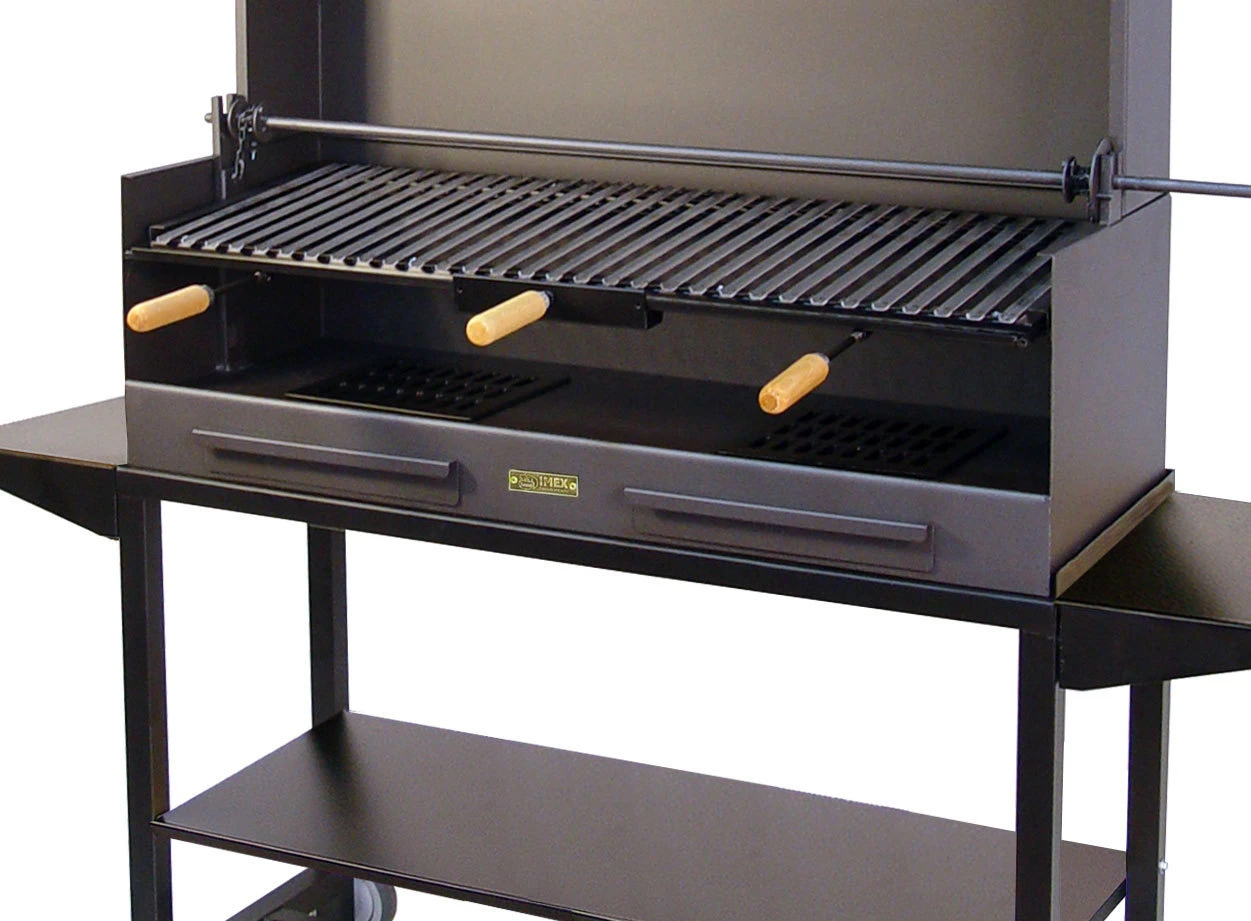 Las barbacoas de Imex El Zorro han sido completamente rediseñadas. Los cambios más relevantes a destacar son: Elegantes ruedas 4×4 para todo tipo de superficie, elevador reversible, manivela extraíble, cajón recoge cenizas reforzado, parrilla del hogar de hierro fundido, cuba fabricada en acero de alta resistencia lo que nos permite poder usar leña sin problema.