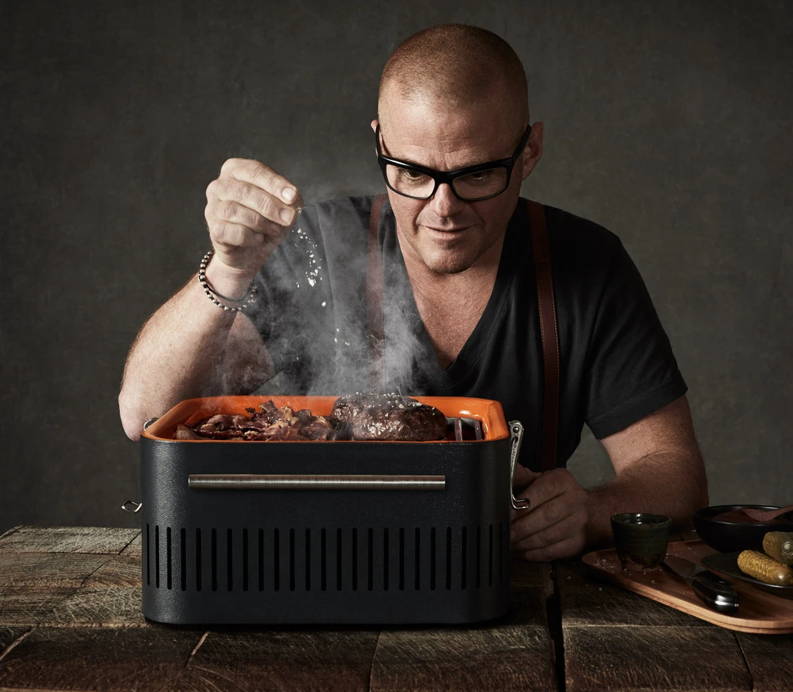 Amigo tanto de la Royal Society of Chemistry, y The Royal Academy of Culinary Arts, a Hesto nunca le ha gustado seguir el libro al pie de la letra. Impulsando los límites de la cocina tradicional, e inyectando la ilusión de los deseos de un niño y el teatro en todo lo que toca, ha inspirado a una generación que busca el placer, y la diversion en la comida. Ahora, Heston le da su toque mágico al disfrute del exterior, haciendo fácil para cualquiera el cocinar con una barbacoa.