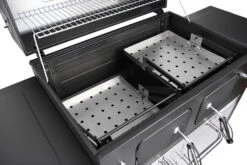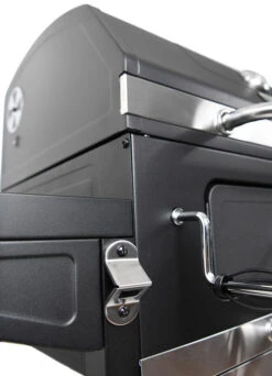 Esta barbacoa viene muy equipada con dos bandeja independientes para las brasas y cada una de ellas se puede ajustar en altura fácilmente con las manivela situadas en la parte delantera de la barbacoa, termómetro integrado en la tapa, práctico abrebotellas, 2 puertas de Acero Inoxidable y 2 amplias mesas laterales.