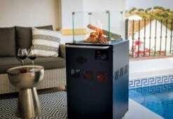 La estufa Alesund es un calentador de terraza móvil que trabaja con gas butano y propano, combinando el fuego visible con el calor que desprende este. Gracias a su llama alimentada por los troncos cerámicos, el calor circula en el interior y se exterioriza por los cuatro lados de la parte superior. Además gracias al calentamiento del cristal protector, también emite calor infrarrojo a corta distancia.