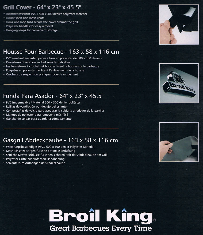 Las fundas Broil King de la gama Select están fabricadas en PEVA (mezcla de plástico y vinilo) son duraderas y resistentes a la imtemperie. La capa exterior de la funda es de poliéster de densidad 500 x 300D.