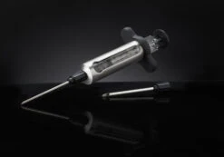 El cuerpo del inyector está hecho de acero inoxidable y tiene una ventana transparente. Se suministra con una aguja fina y una gruesa. La aguja más fina es perfecta para salsas y marinadas líquidas, manteca, vino, etc. La aguja más gruesa es perfecta para marinadas y adobos que contienen ingredientes finamente picados como ajo o hierbas.