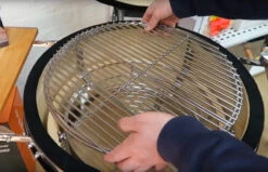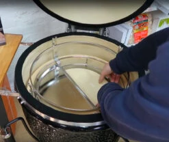 Sistema inteligente de parrillas: Este ingenioso sistema ofrece una funcionalidad inigualable. Completo con marco de metal y un gancho tipo araña desmontable, puede levantar todo el sistema (incluidas 2 parrillas de cocción, 2 piedras deflectoras y 2 bandejas recogegrasas) para meterlo o para sacarlo del Kamado Monolith en un simple movimiento.