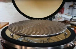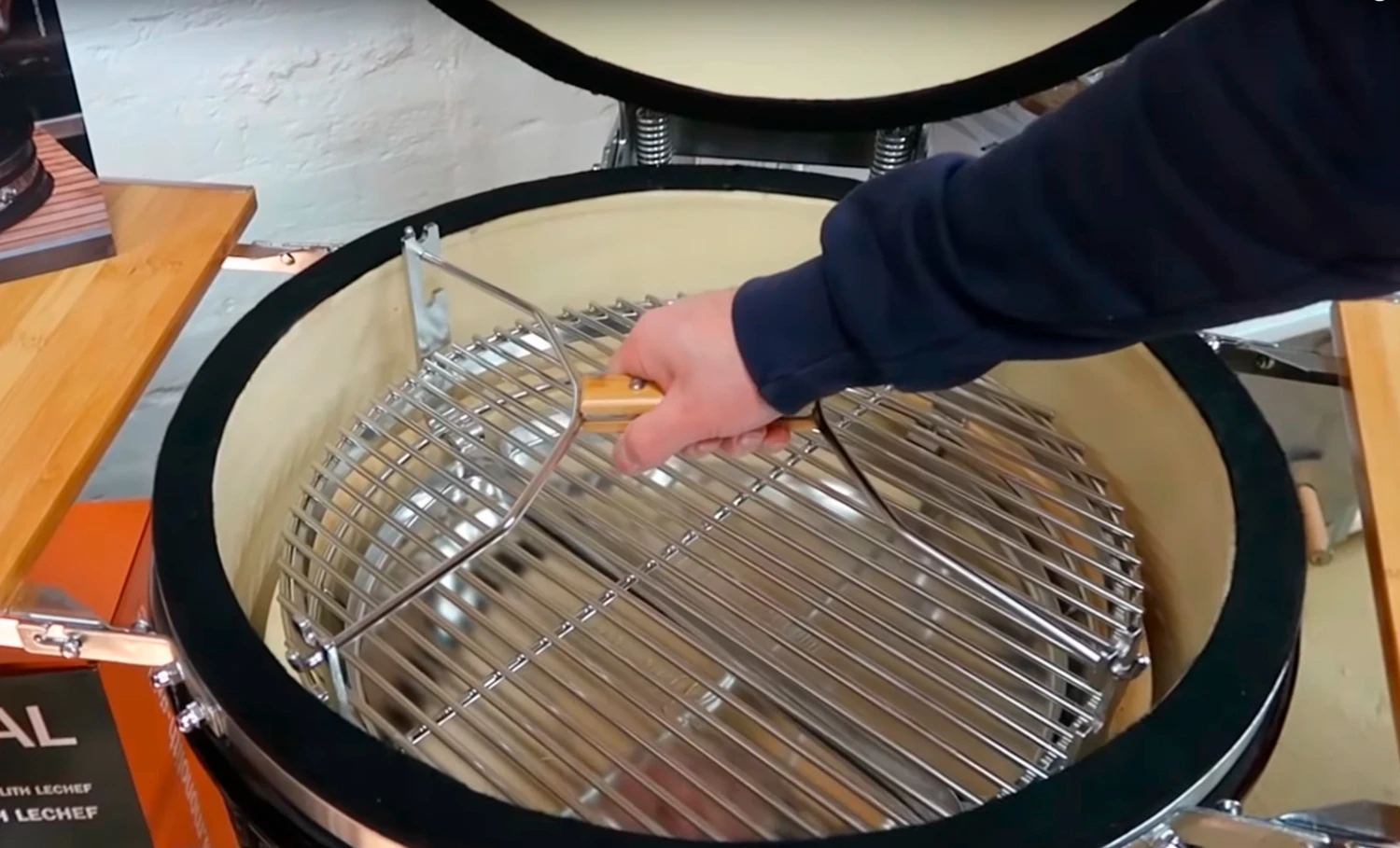 Sistema inteligente de parrillas: Este ingenioso sistema ofrece una funcionalidad inigualable. Completo con marco de metal y un gancho tipo araña desmontable, puede levantar todo el sistema (incluidas 2 parrillas de cocción, 2 piedras deflectoras y 2 bandejas recogegrasas) para meterlo o para sacarlo del Kamado Monolith en un simple movimiento.