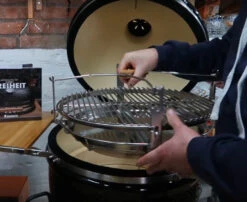 Sistema inteligente de parrillas: Este ingenioso sistema ofrece una funcionalidad inigualable. Completo con marco de metal y un gancho tipo araña desmontable, puede levantar todo el sistema (incluidas 2 parrillas de cocción, 2 piedras deflectoras y 2 bandejas recogegrasas) para meterlo o para sacarlo del Kamado Monolith en un simple movimiento. Kit brasero: Diseño de vanguardia, está segmentado y asentado en un marco de Acero Inoxidable que presenta un compartimiento integral cóncavo para las cenizas.
