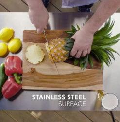 – Encimera de trabajo fabricada en Acero Inoxidable 304,lo que la hace muy resistente, estable y muy fácil de limpiar (garantía de máxima higiene).