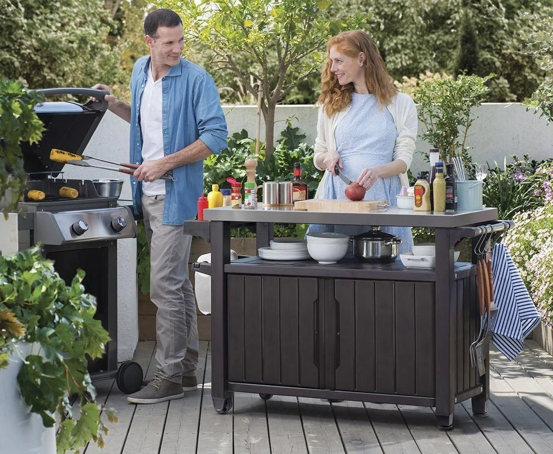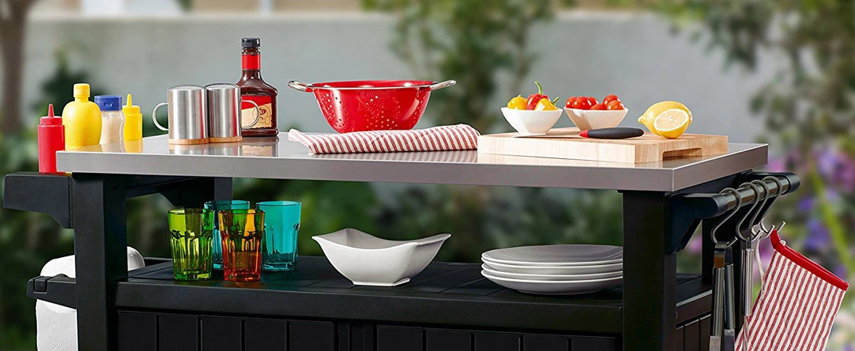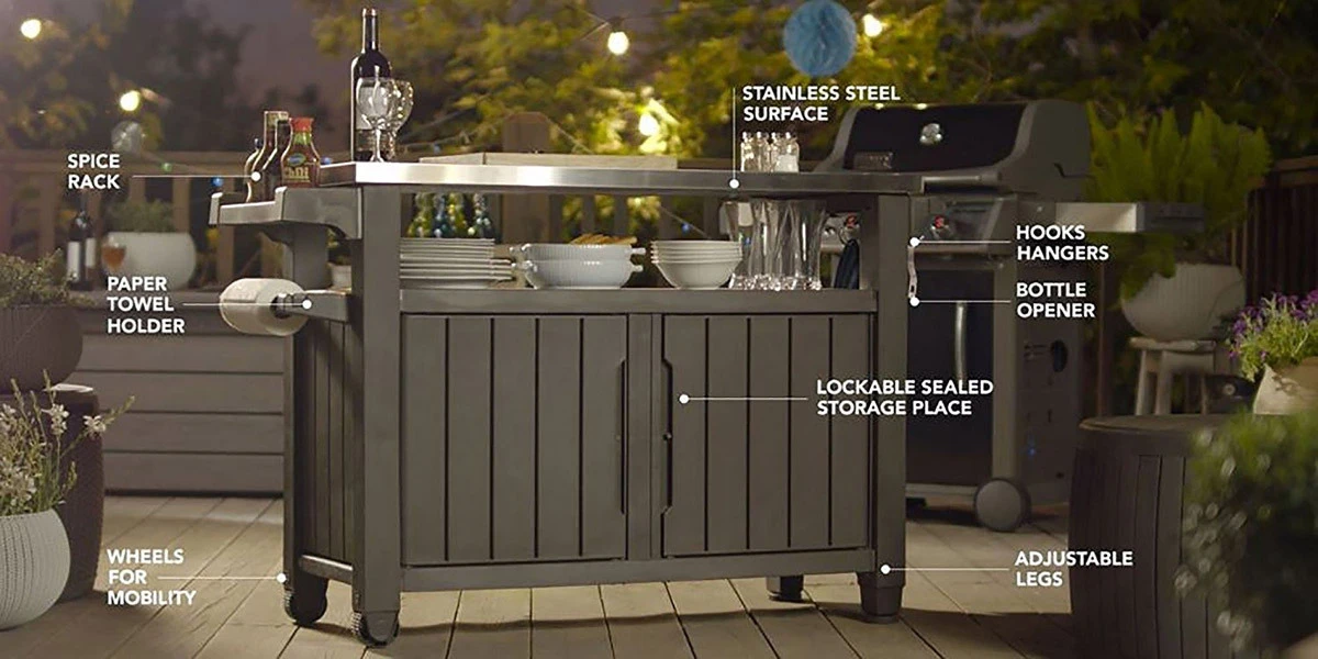 Este mueble de Keter es la solución todo en uno para facilitar el uso de la barbacoa y otras reuniones al aire libre en familia y con amigos. Es de uso múltiple por lo que le dará la solución que necesita y le permite realizar una variedad de funciones desde preparar la comida para la barbacoa, a una mesa de servir o estación de jardinería.