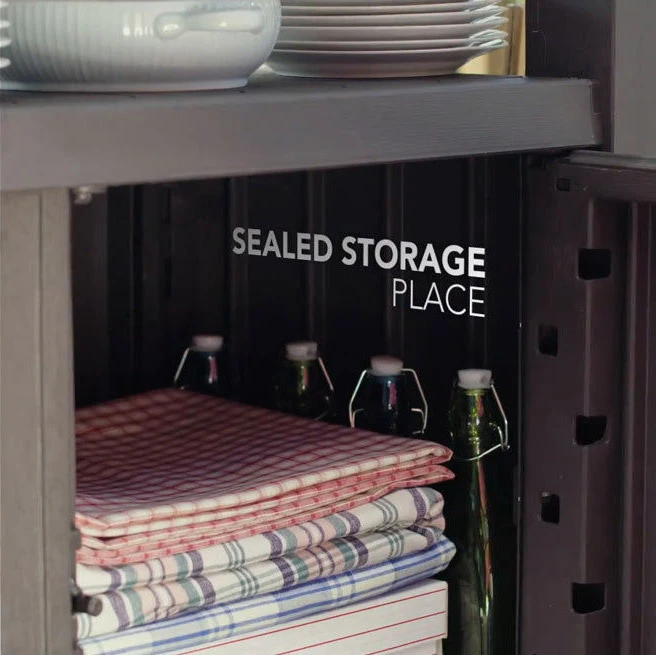 – Tiene espacio de almacenamiento abierto y también espacio de almacenamiento cerrado y sellados, lo que lo hace ideal para el uso tanto en interior como en exterior.