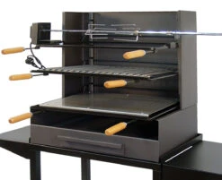 Cajón con carro fabricado en hierro forjado con pintura resistente a 800 ºC, soporte para la leña y base de ladrillo refractario.
