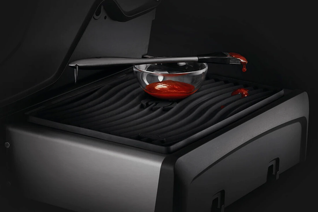 Cuando las cosas se pongan muy sucias, como cuando esté haciendo sus famosas costillas, quite fácilmente la alfombrilla para estantes laterales y métala en el lavavajillas para su limpieza.