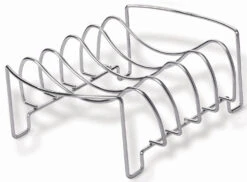 El soporte para costillas de acero inoxidable ofrece espacio para hasta 6 costillas y también se puede utilizar como cesta para asar. Con el portaaves dúo puede preparar pollos crujientes y jugosos de forma muy cómoda. Las latas de cerveza también se pueden sujetar en los dos soportes redondos para preparar el popular «pollo a la lata de cerveza».