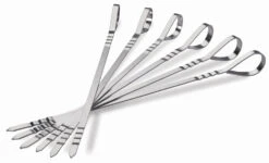 Como accesorio adicional, el set incluye 6 brochetas grandes de acero inoxidable . La forma plana y ancha evita que la comida a la parrilla gire en el pincho.