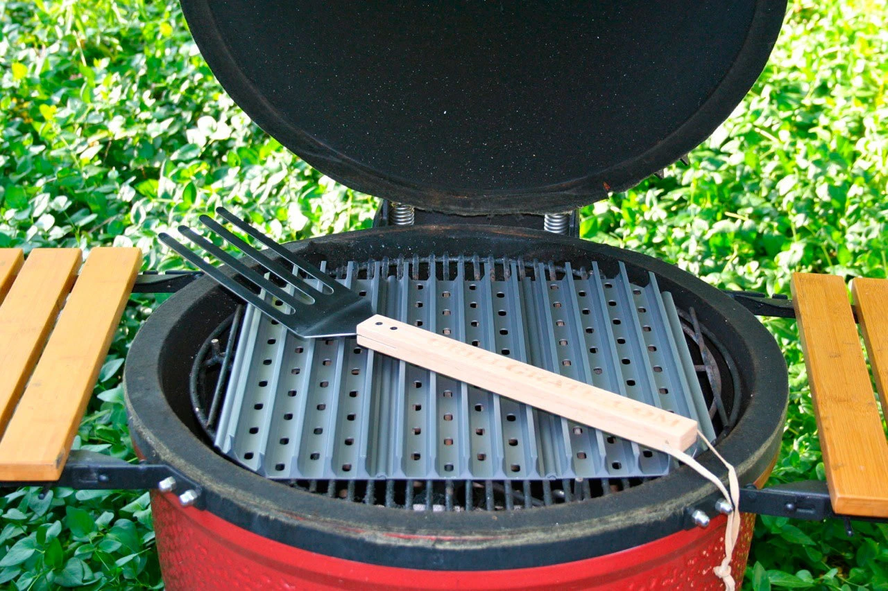 Este modelo de GrillGrate se compone de 3 piezas de 34,92 x 13,34 cm. (Fondo x Ancho) y encaja perfectamente en el modelo de barbacoa Green Egg grande, y en todos los modelos de 45 cm. de diámetro.